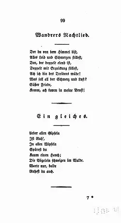 - Poutníkovy noční písně (Wandrers Nachtlied), jde o dvě autorovy básně, první z roku 1776 a druhá z roku 1780, obě zhudebnil Franz Schubert, česky 1889.