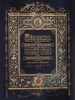 - ↑ a b c d MAGER, Jan Antonín. Johann Zdiarsky starosta města Prachatice v letech 1891 - 1907. S. 17. Rodopisná revue on-line Rodopisné články, metodické materiály, výběr z pramenů a literatury. Stránky se věnují hlavně jižním a.jihozápadním Čechám.. [online]. Historicko-vlastivědný spolek České Budějovice [cit. 2019-07-26]. Roč. 13 (2011), čís. 2, s. 17. Dostupné online.