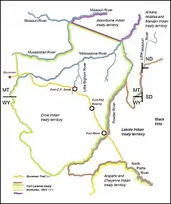 Bozemanova stezka (žlutě) procházející indiánskými územími vymezenými smlouvou s Fort Laramie z roku 1851. Stezka procházela převážně územím Vraních indiánů, na které si však v 60. letech 19. století již činili nárok Lakotové.