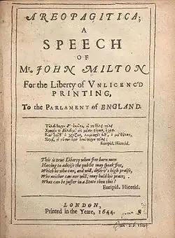 V červnu 1642 se oženil se šestnáctiletou Mary Powellovou, která se o měsíc později vrátila ke své rodině. Po dobu dalších třech let Milton publikoval sérii pamfletů zabývajících se etickou stránkou rozvodu (The Doctrine and Discipline of Divorce), ve kterých napadá britský zákon týkající se manželství, přebraný v nezměněné podobě ze středověkého katolicismu.[6] V roce 1644 jako reakci na nepřátelské výpady proti svým traktátům sepsal Milton Areopagitiku (Projev pana Johna Miltona k Parlamentu za svobodu nepovolených tisků), v níž se vyjadřoval proti předběžným zásahům cenzury. Zákaz lživých a pomlouvačných tiskovin měl být vydán až po jejich uveřejnění.[6][9] V roce 1645 vydal John Milton sbírku poezie pod názvem Básně. Předchozí knihy Comus (1637) a Lycidas (1638) vyšly bez uvedení jeho jména.