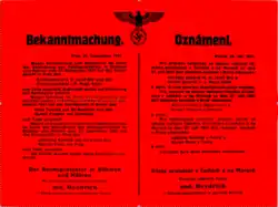 - ↑ Současně s vydáním těchto nařízení vydal Heydrich rozkaz k zatčení předsedy protektorátní vlády generála Aloise Eliáše a podepsal šest rozsudků smrti. Odsouzeni byli armádní generál Josef Bílý, divizní generál Hugo Vojta, Alois Trneček z Rousínova, Rudolf Pospíšil z Drnovic, Ladislav Kuzmák a Václav Franz z Prahy. Generál Eliáš byl dne 1. října 1941 rozsudkem lidového soudu odsouzen k smrti a dne 19. června 1942 popraven.