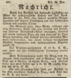 Tiskařský závod Josefa Zwettlera (Zettler & Nikl) se nezabýval pouze vydáváním grafických děl. V roce 1831 inzeroval vydávání operních předeher (ouvertur) v úpravě pro čtyřruční piano. Edice vycházela týdně, titulní list obsahoval vyobrazení vztahující se k ději opery. Vyšly tak také Mozartovy předehry Don Giovanni, Únos ze serailu a Titus.[10]