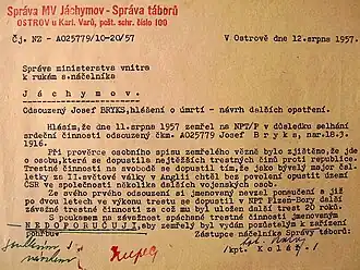 - ↑ „Za první čtyři měsíce roku 1956 plní Josef Bryks normy v průměru na 120 procent, ačkoli je zařazen na poměrně těžké práce,“ uvádí se v posudku náčelníka vězeňského ústavu v Ostrově nad Ohří z května 1956.[1]