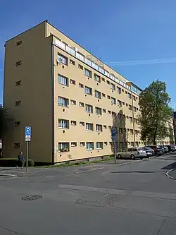 V domě se nacházely jednopokojové a dvoupokojové byty s halou i příslušenstvím. Ve všech bytech byla zavedena teplá voda pro kuchyni a koupelnu, užitková voda byla vedena zvlášť. Sporáky byly elektrické, pro odpadky byl zařízen shoz, v kuchyních byly rezervní komínové bloky. Všechny byty byly přímo osvětleny a příčně větrány. Každý byt měl domácí telefon s připojením na státní linku.