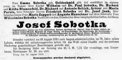 - ↑ a b c d Josef Sobotka gestorben. Bohemia. Srpen 1910, roč. 83, čís. 226, s. 4. Dostupné online.