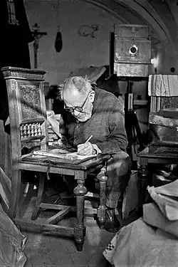| „ | Kus ramene a pravou ruku urvala mu první světová válka. Nikdy o tom nemluvil. Když rukoval na vojnu, byl vyučený knihař. Když se vrátil, nebyl nic. Ze zlé nutnosti učil se fotografem, ale toto řemeslo si zamiloval a vyučil se mu mistrně.[8] | “ |