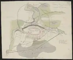 Mapa Josefova s plánem budoucí pevnosti (kolem roku 1780). Text uvádí, že výstavba se odchyluje od plánu.