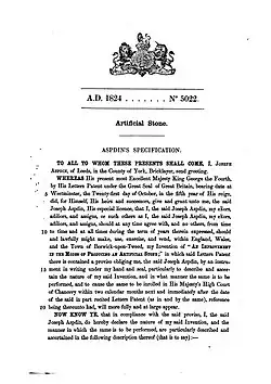 Svůj výrobek nazval portlandský cement, neboť maltová směs z něj vyrobená se podobala „nejlepšímu portlandskému kameni“. Portlandský kámen byl v té době nejpoužívanějším stavebním kamenem v Anglii. Patent nepopisuje produkt, známý dnes jako portlandský cement, zcela jasně. Produkt byl cílen na trh se štukatérskými produkty a také pro výrobu architektonických článků (ostění, římsy, klenáky, apod.), kde se hodil rychle tuhnoucí nízkopevnostní cement. Ten byl získán vypalováním při nízkých teplotách (pod 1250 °C) a proto neobsahoval žádný alit.