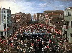 - Bitva na mostě Ponte dei Pugni v Benátkách, sbírka Jiřího Lobkowicze, zámek Mělník; obraz líčí oblíbený zápas, který se každoročně v září odehrával na benátském mostě a na nábřeží; zúčastnily se ho dvě rodiny, Castellani a Nicoletti, jejich úkolem bylo shodit příslušníky druhé rodiny z mostu; na kanále již byli připraveni gondoliéři s gondolami, kteří spadlé vytahovali z vody; asi 1672-1673;