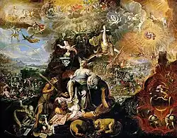 - Alegorie Moudrosti - moudrost je zpodobena jako krásná žena korunovaná Merkurem, u nohou jí sedí Terra a Herkules s jablky Hesperidek, vpravo Sisyfos (nebo Atlas); dále Chrónos a Génius se symboly svobodných umění a pár lvů (pravděpodobně Hippomenes a Atlante). V krajině se pohybují nereidky a kentauři. Atmosféra a barevnost upomínají na fantaskní zobrazení pekla na způsob Hieronyma Bosche, pekelný vůz je odvozen z pláten Giulia Romana; Kunsthistorisches Museum Vídeň.