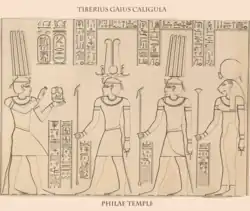 Caligula před bohy, vpravo bohyně Tefnut;[4] chrám Philae