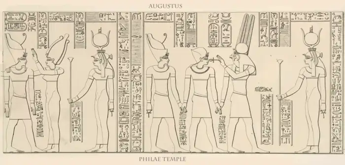 Augustus je vítán egyptskými bohy, zleva: 2. Nechbet, 3. Isis, 5. Atum, 6. Monthu, 7. Isis; chrám Philae