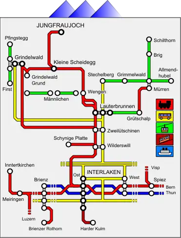 Oblast má velmi dobře propracovanou dopravní obslužnost jak pro obyvatelstvo, tak zejména pro turistický ruch. Doprava opravdu funguje jako podle švýcarských hodinek. Tato přesnost umožňuje přepravit velký počet osob v krátkém časovém úseku. Orientační mapka zobrazuje strukturu dopravy v oblasti. Železniční tratě jsou navzájem propojeny, přesto každý úsek tratě provozuje jiná společnost. Pro náročné je možno si objednat leteckou dopravu (místní letiště, malé letadlo, vrtulník) na trase Interlaken - Bern.