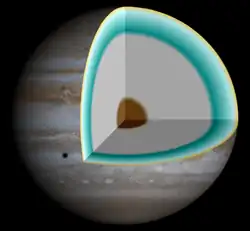 Oblast hypotetického jádra je pravděpodobně obklopena hustým kovovým vodíkem, který by se měl rozkládat až do vzdálenosti 78 % poloměru planety.[25] Procesem podobným dešti by hélium a neon měly prostupovat touto vrstvou sníženého zastoupení těchto prvků ve svrchní atmosféře.[11][31]