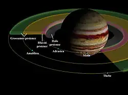 - ↑ a b BURNS, J. A.; SHOWALTER, M.R.; HAMILTON, D.P. The Formation of Jupiter's Faint Rings. Science. Roč. 1999, čís. 284, s. 1146–50. Dostupné online [cit. 2007-08-28]. doi:10.1126/science.284.5417.1146. PMID 10325220.