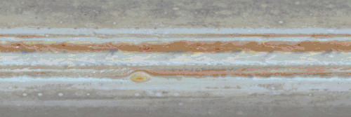 Typické oranžové a hnědé zbarvení mračen Jupiteru je způsobeno barevnými sloučeninami, známými jako chromofory. Vystupují z oblastí teplejších spodních mračen a jsou následně vystaveny ultrafialovému záření ze Slunce. Složení těchto sloučenin je v současnosti stále neznámé, ale předpokládá se, že budou obsahovat fosfor, síru a pravděpodobně i uhlovodíky.[25][39] Světlá pásma jsou tvořena tehdy, když konvekční buňky tvořené krystalky amoniaku zakryjí nižší mračna.[40]