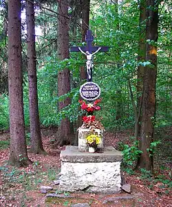 Na hluboké podezdívce byl zasazen kovový kříž s tabulkou, nesoucí český a německý nápis. Ze dvou stran kříže byly pokáceny překážející stromky a zřízeny dvě cesty a u kříže byla postavena tři klekátka.
