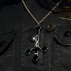 Satanisté, zejména následníci LaVeyova satanismu nazývají graficky stejný symbol satanský nebo obrácený kříž a pokládají jej za symbol různých významů čísla čtyři (čtyři živly, čtyři světové strany), symbol duchovního rozcestí a zároveň za symbol odmítnutí křesťanských hodnot,[4] zesměšnění a odmítnutí symboliky Krista a jeho utrpení.[5] Obrácený kříž je satanisty mnohdy nošen na krku či na oblečení, kdy může mít podobu obráceného krucifixu nebo je v kombinaci s jiným satanským symbolem jako je obrácený pentakl, obrácený pentagram či kozlí hlava Bafometa. Dostal se i do znaků mnoha hudebních skupin. Podle některých výkladů znamená "ze země zrozený meč ducha mířící k nebi", symbol falu směřujícího k nebi, tedy jakéhosi znásilnění Boha, odkazuje se v této souvislosti i na příběh o Babylónské věži.[6] I když satanský kříž vznikl obrácením latinského kříže,[7] a poukazuje se i na to, že právě Petra Kristus jednou v evangeliu oslovuje jako satana, když se jej Petr snaží odvrátit od úmyslu nechat se ukřižovat: „Jdi mi z cesty, satane; tvé smýšlení není z Boha, ale z člověka!“ (Marek 8,33), se symbolikou kříže sv. Petra satanský kříž nesouvisí. Podle jiné interpretace to byly některé přírodní domorodé národy, které se bránily dotěrným misionářům mimo jiné tím, že křesťanské kříže převraceli vzhůru nohama. Tím měli domorodci demonstrovat svůj odpor a nechuť ke konverzi. Není však jasné, kdy a kde k tomu přesně mělo dojít.