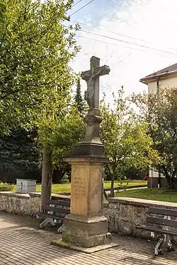 Na hranolovém soklu je umístěn pilíř zakončený římsou, na které je umístěn menší sokl, na kterém stojí kříž s korpusem Krista oděného pouze do bederní roušky. Na přední straně pilíře je umístěna reliéfní kartuše s nápisem: ó Wy WšICknI kteřIž gDete okoLo,pozorugte gestLI boLest gako boLest Ma.Ier:1.12.