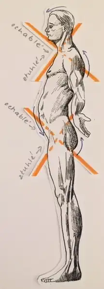 Vpředu zkrácené prsní svaly a vzadu ochablý široký sval zádový.