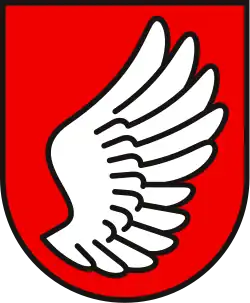 Ležící rudé orlí křídlo se zlatým půlměsícem (sponou), vpředu s orlí hlavou natočenou vpravo, vzadu uzavřené jetelovým lístkem (obec Heinsheim Německo) |