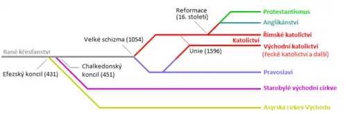 - Starokatolictví – odštěpilo se od římskokatolické církve v 19. století kvůli nesouhlasu se závěry Prvního vatikánskeho koncilu.