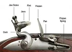 Princip křesadlového zámku je patrný z animace, Na obrázku v úvodu článku jsou popsány jednotlivé součásti zámku. Otočný kohout (anglicky cock), je poháněn pružinou natahovanou střelcem. Kohout má v čelistech stažených šroubem (anglicky jaws, jaw screw) uchycený křesací kámen (flint).