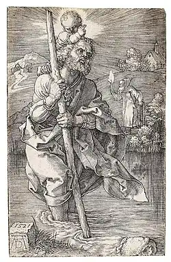 Světec je zobrazen v duchu tradiční ikonografie a středověké legendistiky. Zobrazení znázorňuje všechny atributy: statný muž kráčí vodou, opírá se o masivní hůl v podobě kmene stromu a na ramenou přenáší na suchý břeh Ježíška.[21] Postava je zobrazena tříčtvrtečním profilem doleva. Za levým ramenem sv. Kryštofa se na obzoru za vodou vypíná skalisko a na něm stojí domek se sedlovou střechou a drobnou víškou (patrně sanktusníkem), který lze v duchu legend interpretovat jako kapli, před kterou vyrůstá košatý strom. Bohatá zalamovaná drapérie světce vychází z pozdně gotických předloh. Petr Pavelec[17] upozornil na možné souvislosti s významnými archivně doloženými předlohami. Prototypem celé této skupiny grafických listů, které se nápadně prachatickému sgrafitu podobají, byl nepochybně mědirytAlbrechta Dürera z roku 1521, který jeho následníci a kopisté zpracovávali až na drobné obměny a kvalitativní různost ve shodném provedení[17].