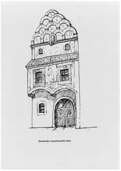 ↑Pravděpodobný vzhled domu čp. 36 v renesančním stylu v době vzniku zpracovali restaurátoři Skořepa a Mašek v barevné fotodokumentaci ke své restaurátorské zprávě