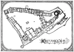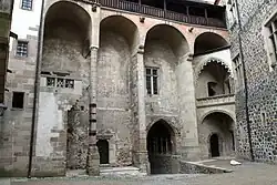 Na nejvyšším místě hradní dispozice se tyčí 42 m vysoký bergfrit, za ním je umístěno relativně těsné jádro hradu, které je tvořeno trojicí křídel obklopujících trojúhelné nádvoří. Jižní křídlo obsahuje rozměrnou hradní kapli Korunování Panny Marie. Západní křídlo obsahuje především velký sál a spolu se severním (královniným) křídlem, v němž byly původně menší soukromé prostory, tvoří hradní palác.