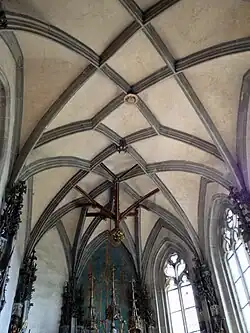 Oltář je uměleckou prací z doby po roce 1490, jejímž autorem je neznámý mistr, který pravděpodobně pocházel z okruhu Hanuše Spiesse z Frankfurtu nad Mohanem. Má podobu křídlové archy s dřevořezbou Korunování Panny Marie v centrální části, která je doplněna malovanými výjevy ze života Panny Marie a světců.[16] Autorem maleb je neznámý malíř označovaný jako Mistr křivoklátského oltáře. Pohled Panny Marie směřuje do velké kamenné sedile vpravo v presbytáři, kde bývalo místo určené pro panovníka a jeho rodinu. Nad sedilií se původně nacházely dva znaky Českého království, ale během obnovy kaple na počátku dvacátého století byly sejmuty a nahrazeny fürstenberskými rodovými erby.[zdroj?]