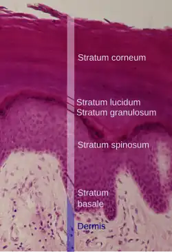 - Pokožka (epidermis) je nejzevnější vrstva těla i kůže, histologicky vícevrstevnatý dlaždicový epitel na povrchu zrohovatělý.[19] Základní keratin produkující buňky v různém vývojovém stádiu, keratinocyty, jsou uspořádány do pěti vrstev. Epidermis obsahuje také melanocyty s tvorbou melaninu, hvězdicovité Langerhansovy buňky a mechanoreceptory v podobě Merkelových buněk.[20] Keratinizační proces se odehrává dominantně ve středních vrstvách.[19] V nejpovrchnějších vrstvách, tzv. stratum disjunctum, již buňky nemají mezibuněčná spojení, přítomné jsou pouze mrtvé rohovité destičky, odlupující se ve formě šupinek (exfoliace), které tvoří kožní prach. Proces obnovení pokožky od vzniku až k exfoliaci u člověka trvá mezi 15–30 dny podle individuálních odlišností.[21][22] Pemphigus vzniká ztrátou mezibuněčných spojení keratinocytů. Jejich pět vrstev je uspořádáno směrem od povrchu: