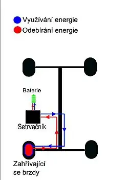 K výrobě elektrické energie je zde využíván generátor MGU (Motor General Unit), který je propojen s hnací hřídelí. Přeměna energií nastane sešlápnutím brzdového pedálu. Energie z brzdění se uchová v lithio-iontových akumulátorech s napětím 3–6 V. Energie se uvolní stisknutím tlačítka na volantu a tím přemění jednotku MGU v elektromotor, který využije energii uloženou v akumulátorech. Na řízení systému KERS dohlíží elektronické řídící jednotky nazývající se KCU (Kers Control Unit).