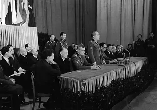 Devítičlenné předsednictvo Komitétu: Po levé ruce řečníka sedí Andrej Andrejevič Vlasov. Berlín, prosinec 1944