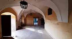 Přízemí dominuje vstupní centrální hala, zaklenutá valenou klenbou s lunetovými výsečemi, na kterou navazuje schodiště na poschodí, uzavřené vstupem s dekorativním kamenným portálem. Valené klenby se rovněž zachovaly v některých místnostech severozápadního traktu, ostatní místnosti jsou plochostropé. Původní trámové stropy byly nahrazeny během rekonstrukce v polovině 20. století novými.