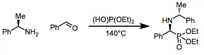 Byly také vyvinuty enantioselektivní varianty této reakce, například při zapojení α-methylbenzylaminu vzniká chirální, neracemický α-aminofosfonát.[5]