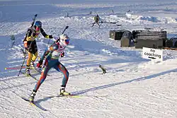 Kaisa Mäkäräinenová v závodě Světového poháru 2011/12 ve finském Kontiolahti , za ní Němka Magdalena Neunerová