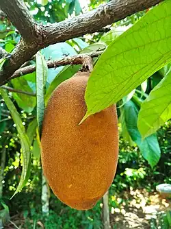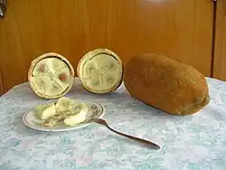 Plod ve zralosti připomíná svým tvarem nafouknutou vejčitou nebo kulovitou okurku hnědé barvy. Je z botanického hlediska bobule, může být dlouhý do 24 cm, široký téměř 12 cm a největší váží až 1,5 kg. Je podélně rýhovaný, mívá 25 až 50 semen obklopených kašovitou dužinou a ve zralosti má hnědé a velice pevné oplodí, které se nerozpadne ani po pádu se stromu a na rozdíl od rozvitých květů plod příjemně a intenzivně voní. Oplodí je tvrdé, kožovité až dřevnaté a hustě plstnaté, vnitřní dužina zabírající asi třetinu prostoru plodu je krémově bílá, šťavnatá, voňavá a nejčastěji se jí syrová jako chutné ovoce. Plody ve zralosti opadnou se stromu celé, oplodí se přitom většinou nepoškodí a semena zůstanou skrytá uvnitř, při pěstování se jejich hrubé stopky odřezávají noži upevněnými na dlouhých tyčích. Je snahou neporanit na stromě místo, ze kterého plod vyrůstal, obvykle v jeho nejbližším okolí vyrostou příští rok nové květy. Semena jsou tvrdokorá, světle hnědá, o málo větší než mandle a jsou uložená vedle sebe v pěti podélných řadách.[2][3][5][6][7][8]