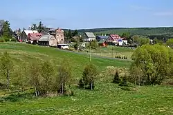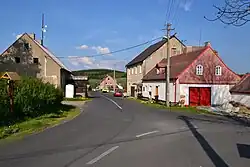 ![]() Pohled ze středu na východní část vesnice s kostelem svatého Václava | |