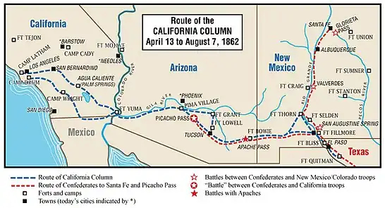 Vojska Kalifornské kolony se před začátkem vojenského tažení soustředila ve vojenské pevnosti Fort Yuma, ležící na kalifornsko-arizonské hranici na západním břehu řeky Colorada. Na pochod se vojáci vydávali v oddělených skupinách, vždy v rozmezí několika dnů, aby se podél trasy stačily naplnit studny a obnovit prameny. Naprostou většinu pochodu šli vojáci pěšky a ve vysokých pouštních teplotách byli oblečeni do vlněných uniforem. K pochodu využívali v té době již nepoužívanou poštovní cestu společnosti Butterfield Overland Mail, která spojovala San Francisco s Memphisem a Saint Louis a bývalé poštovní stanice sloužily pro postupující armádu jako zásobovací sklady. V opačném směru tuto trasu používaly k výpadům proti armádě Unie i Konfederační jednotky a proto po celé její délce docházelo k bojovým střetům.