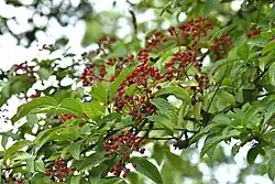 Dozrávající plodenství kaliny tušalaje: nezralé plody červené, zralé černé -