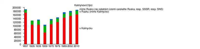 Demografický vývoj kalmyckého národa za posledních sto let podle sčítání[2][4][14][15][16][17][18][19][20] udává graf níže.