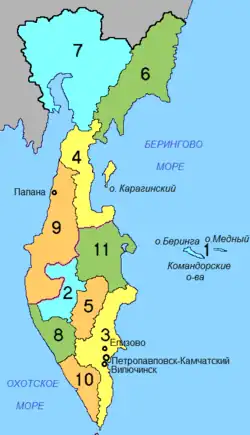 Kamčatský kraj se člení (s účinností od 15. června 2020) na 3 městské a jeden obecní okruh a 10 rajónů (4 z nich: Karaginský, Oljutorský, Penžinský a Tigilský jsou zahrnuty do Korjackého okruhu (dříve Korjacký autonomní okruh) – správní a územní jednotky se zvláštním statutem se střediskem v obci Palana).