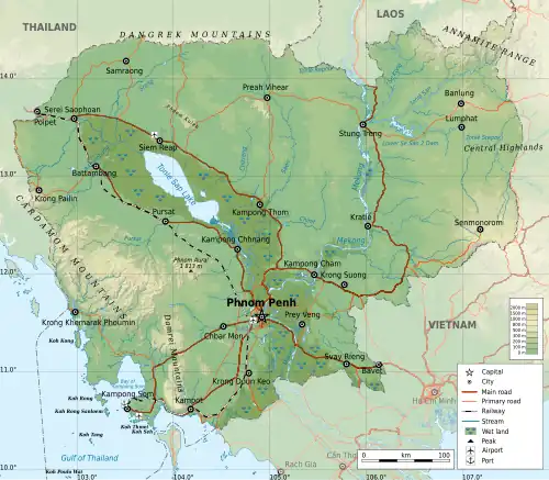 - ↑ GEOGRAPHY [online]. The Royal Embassy of Cambodia [cit. 2016-06-07]. Dostupné v archivu pořízeném z originálu dne 2009-09-14.
