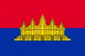 Červená vlajka s modrým okrajem a vyobrazením chrámu Angkor Vat. |