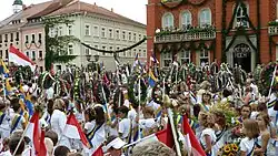 ![]() Pohled na centrum Kamence s radnicí a klášterním kostelem sv. Anny z věže kostela Panny Marie | |