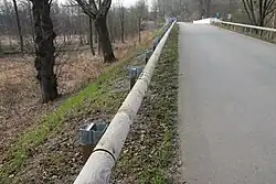 Na předpolí mostu je 1 m široký pás na kraji svahu náspu silnice až ke svahovým křídlům obložen lomovým kamenem tloušťky 200 mm do podkladního betonu tloušťky 150 mm. Do tohoto obložení ústí rubová drenáž.[3]