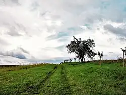 ![]() Kamenný mostek přes starou cestu ze Slotova do Kašova na jižním okraji obce Kuks, v pozadí je kukský hospitál, založený F. A. Šporkem | |