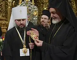 Liturgický oděv pravoslavného kněze, je vidět epitrachil, kamilávka, epigonation a další