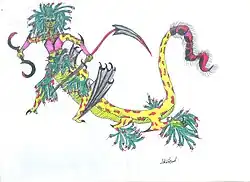 Je popisována takto: Horní část těla se skládá z krásné ženy a spodní část z draka. Má obrovský ocas podobný škorpionímu, napuštěný prudkým jedem, na nohou a kotnících jí visí obrovští jedovatí hadi, má 50 hlav různých tvorů (hadí, medvědí, lví, tygří…), má několik párů rukou a nohou se zahnutě kovovými, velkými drápy, podobající se srpu. Z některých údů chrlí oheň a některé hlavy mají mít na hlavě hady, na zádech má obrovská černá křídla a v rukou třímá meč, kosu nebo i vidle.